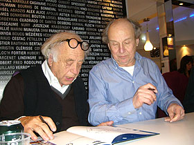 Mézières (rechts) war bei Casterman angekündigt gewesen. Dann aber setzte sich Christin dazu und bekam vom Partner die Alben zum Signieren rübergeschoben. |