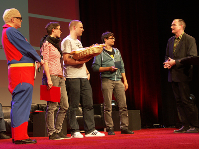 Auf der Bühne erwartet man David Basler, der als Verleger für die Edition Moderne den Preis für "Gaza" von Joe Sacco abholte (Foto Mitte: Jan Taussig (Bulls Press), Dieter Rossmeissl (Stadt Erlangen)).